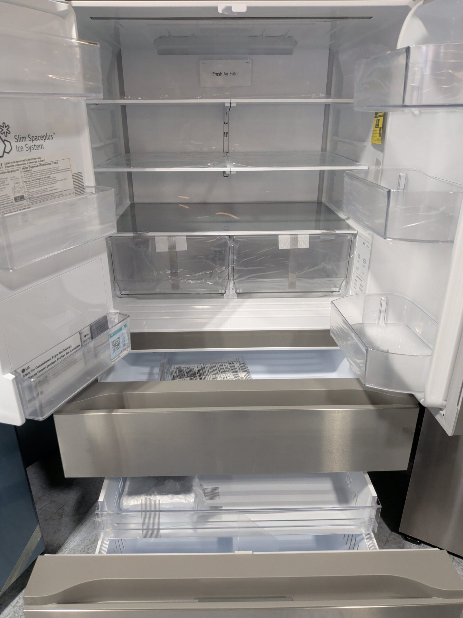 In the main fridge compartment, four split SpillProtector tempered glass shelves, two humidity-controlled crispers, and six door bins (three per door) help you organize everything from tall drink containers to condiments and produce, while Multi Air Flow cooling with Door Cooling+ vents and three temperature sensors work with the Smart Inverter compressor to maintain more consistent temperatures throughout. The tall external ice and water dispenser with LT1000P filtration provides filtered water and cubed or crushed ice at the door, and the Slim SpacePlus in-door ice system plus a second ice maker in the freezer give you dual ice with an in-door storage capacity of about 3.0 lbs and additional production from the freezer icemaker for families and entertaining. ENERGY STAR certification with about 785 kWh/year estimated energy use, R600a refrigerant, door alarm, child lock, auto-closing hinges, Sabbath Mode, LED interior lighting, and SmartDiagnosis support help keep operation efficient and user-friendly for both homeowners and tenants. With its flat-panel doors, pocket handles, 70 1/4 inch overall height, roughly 34 3/8 inch cabinet depth without handles, Wi‑Fi with ThinQ and ThinQ Care, and a modern stainless steel–look finish, this LG refrigerator is a strong, design-forward upgrade for Nashville-area remodels, suburban homes, and luxury rentals that need very large capacity, flexible middle-drawer storage, and smart connectivity in a full-depth French door design