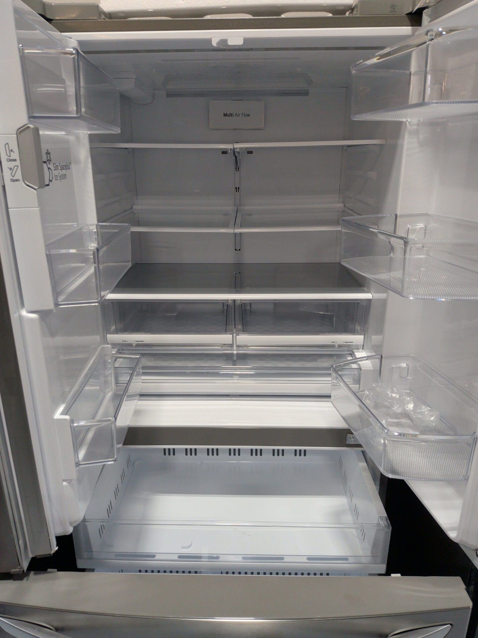 This LG 36-inch, about 27.7–28 cu. ft. 3-door French door refrigerator in PrintProof stainless steel with Dual Ice and Craft Ice is a great option for homes and rentals in the Nashville and Middle Tennessee area that want extra capacity, premium ice, and a clean, modern look. Dual ice makers provide traditional cubed ice plus slow-melting Craft Ice spheres in the freezer, which are ideal for cocktails, iced coffee, and special drinks without needing separate molds. The interior offers around 18.4 cu. ft. of refrigerator space and 9.3 cu. ft. of freezer capacity, with 4 split glass shelves, glide‑n‑serve pantry drawer, humidity-controlled crispers, large door bins, and a 2-tier freezer organization system to keep everyday food, bulk items, and frozen goods easy to find. Smart Cooling with Multi-Air Flow and a smart inverter compressor helps maintain consistent temperature and humidity for fresher produce, while features like IcePlus for increased ice production, external ice and water dispenser, digital temperature controls, and Sabbath Mode add everyday convenience. ThinQ smart technology with WiFi, Smart Diagnosis, and ThinQ Care lets you monitor and adjust settings from your phone, receive proactive alerts, and integrate with smart home assistants, making this refrigerator a feature-rich, family-friendly upgrade for busy Nashville kitchens
