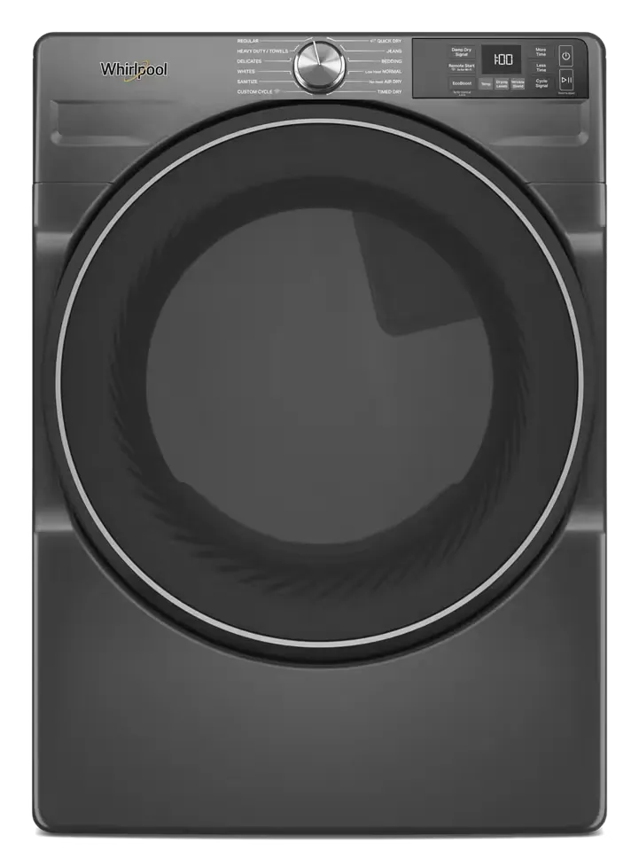 This 27-inch, 7.4 cu. ft. smart front load ENERGY STAR electric dryer in Volcano Black with Wrinkle Shield Option is a strong upgrade for laundry rooms and rentals in the Nashville and Middle Tennessee area that want large-capacity drying, modern styling, and app connectivity. AI Intelligent Dry technology uses multiple sensors to track moisture and temperature and automatically adjust dry time to help prevent overdrying, while Air Flow Detection can alert you when the home vent is restricted so you can maintain performance and efficiency. With 7.4 cu. ft. capacity, 12 cycles, and “What to Dry/How to Dry” selections (Normal, Wrinkle Control, Heavy Duty, Sanitize, Timed Dry, Quick, plus Regular, Delicates, Bulky, Whites, Colors, Towels), this dryer handles everything from everyday loads to bulky items like comforters and sleeping bags. Quick Wash & Dry lets you finish a 10 lb load in under an hour when paired with the matching washer’s 25-minute Quick Wash and the dryer’s 30-minute timed dry, while the Wrinkle Shield Option keeps clothes tumbling for up to 150 minutes after the cycle ends to help prevent wrinkles from setting in. Smart features with the Whirlpool App give you remote start, pause, cycle monitoring, and notifications, and details like 4-way venting, reversible side-swing door with window, interior drum light, EcoBoost energy-saving option, stackable design, and optional pedestal make this dryer a flexible choice for closets, side-by-side or stacked installations across the Nashville area.